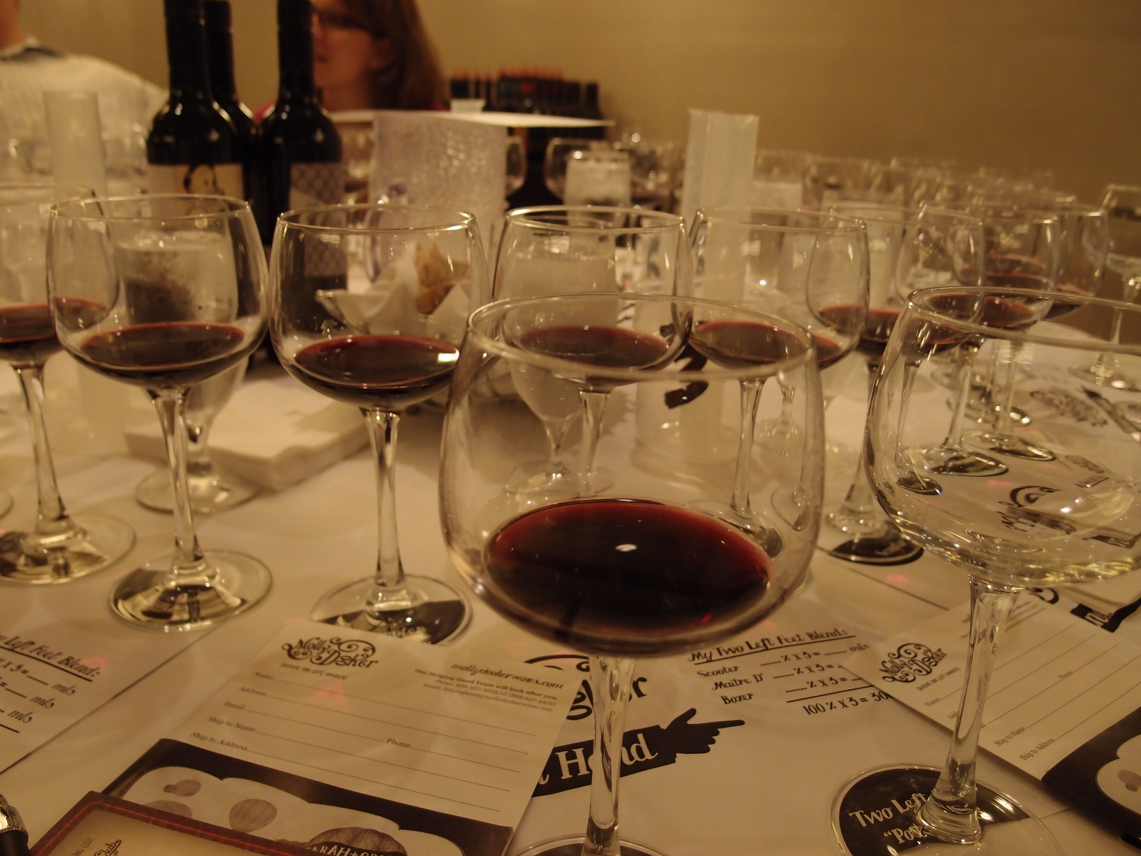We moved to the main event. When we got into the room, there was TON of wine and lots of glasses waiting for the wine. Each setting had five or so glasses. So, we took a deep breath, pulled on our big girl pants and settled in to get an education on Molly Dooker wines.