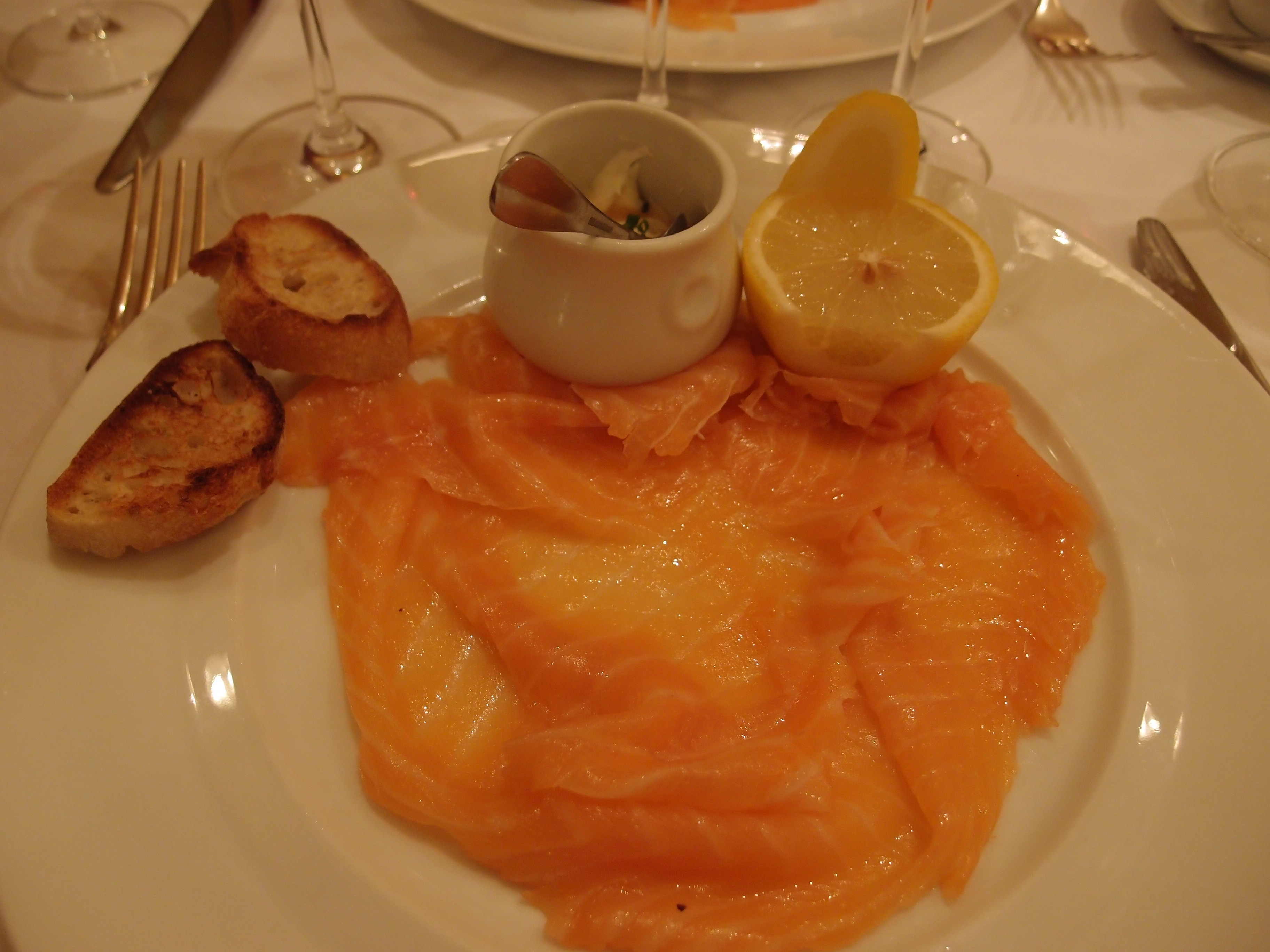 We started with champagne and an amuse bouche of some cream soup with a drizzle of truffle oil. The bread and butter were, of course, excellent. And then there was the smoked salmon appetizer. Yu. Um. Melted on the tongue.