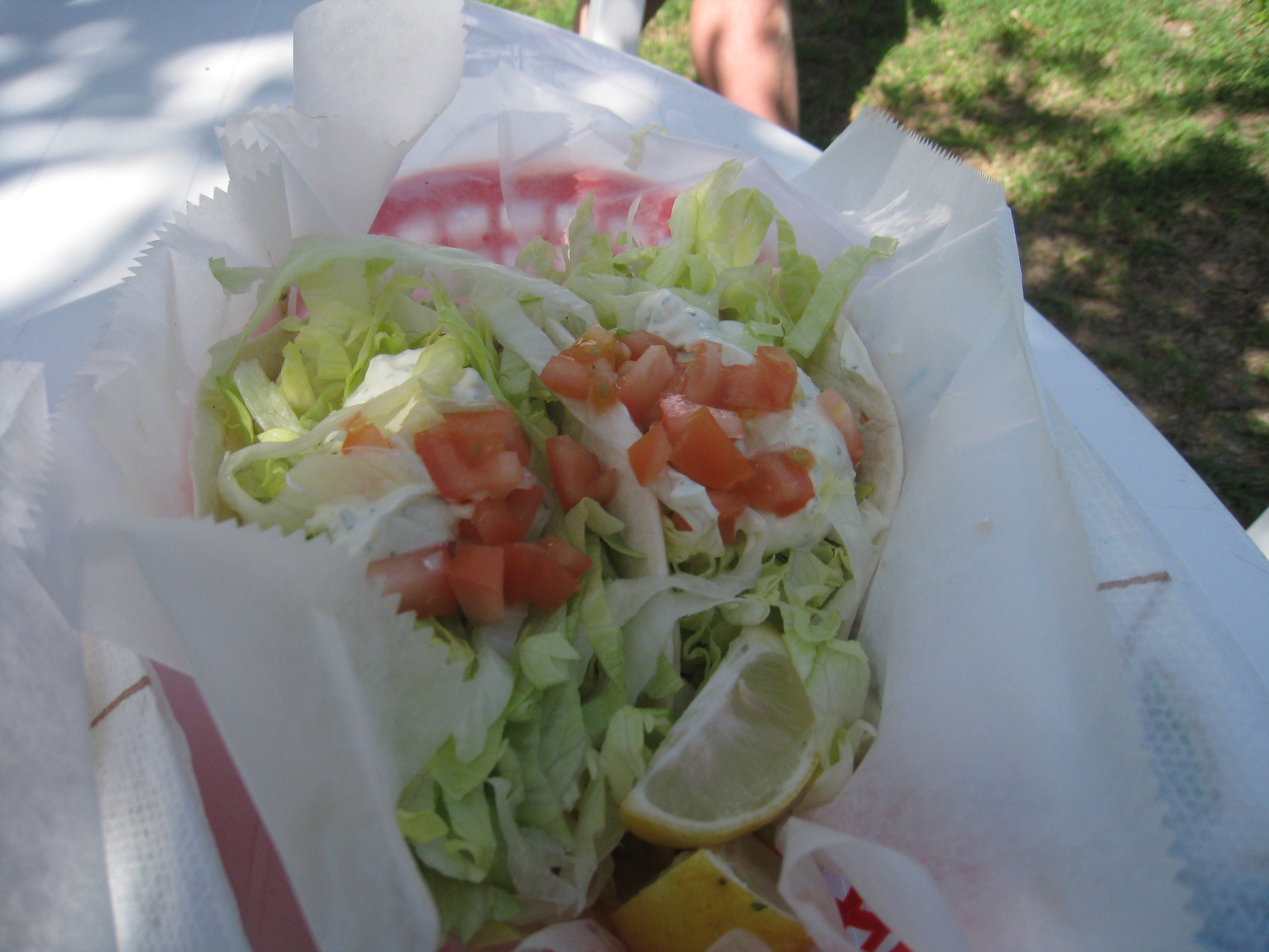 Unlike previous TPFTRs, I did not rush back to my cubicle to partake of this island feast. Instead, XFE and I retired to the area behind the truck, which was replete with white plastic patio furniture. While we waited for our feast, we were regaled by the sound of barking dogs and crowing roosters. Finally, after about a five minute wait, our food arrived.