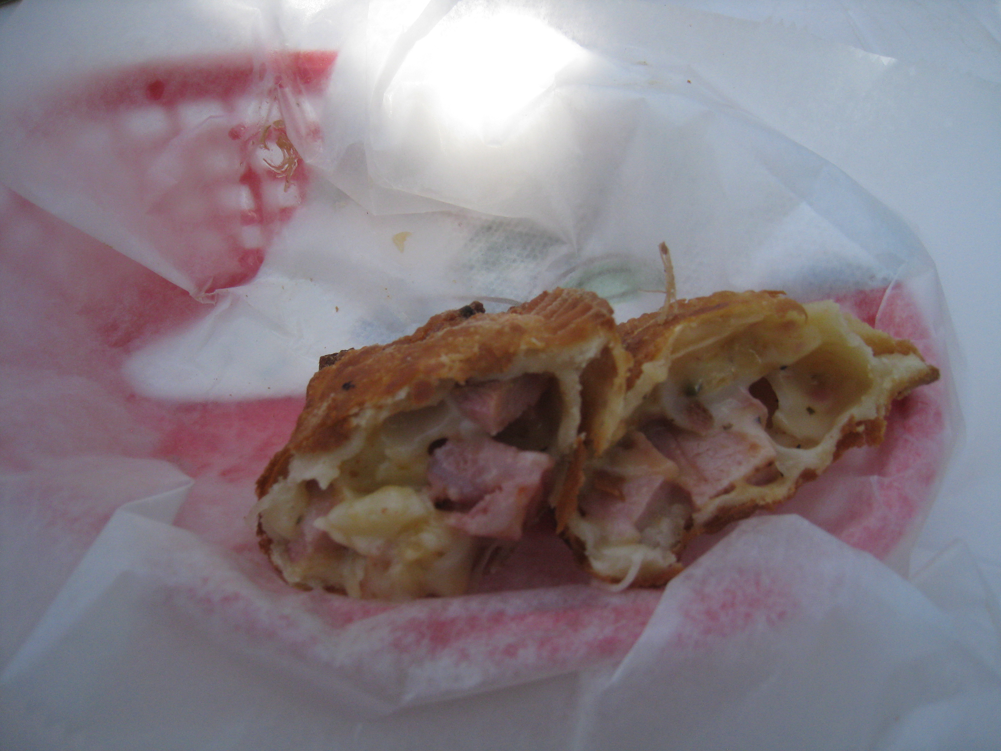 XFE, of course, ordered the pork carnitas ($6), which came two to an order and included tomato, lettuce and a sour cream sauce. I ordered the Bob Marley ($9), a jerk chicken sandwich with pineapple chutney. We also ordered a ham and cheese empanada ($3) to share. I ordered a guava sun tea ($1.50). They also had a huge selection of exotic sounding and colorfully labeled island sodas, including a coconut soda, but despite my pleas, XFE ordered only water.