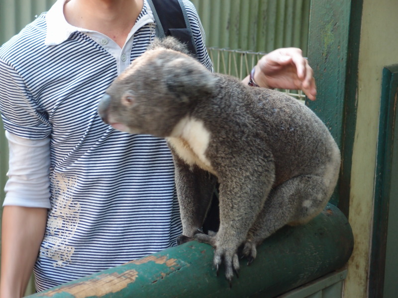 We were standing next to one enclosure (and I use the term loosely – it was more like it was enclosed from humans, but not enclosing the animals), and a koala came over and sat on the wooden railing. After one visitor stood next to him for pictures, another guy moved in to stand next to the koala and it started climbing up on him! I got so excited. I was sure I was about to get some koala cuddling, but a wildlife worker swooped in and broke up the party, chastising all of us for letting a wild animal just climb on one of us.